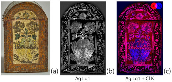 Proper left side of the casket: (a) under visible light; (b) XRF elemental distribution map of silver (Ag); (c) XRF elemental distribution maps of silver (Ag) and chlorine (Cl).