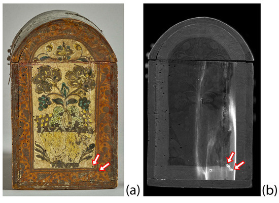 (a) Visible image of the proper left side of the casket. (b) Scanning XRF elemental distribution maps of copper (Cu) of the proper left side of the casket. Arrows mark two furniture beetle holes.