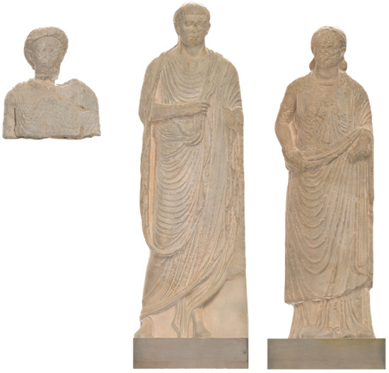 The clasps of both women are known as thistle fibulae due to their resemblance to the thistle flower. These fibulae are better preserved on the statue of the woman that survives as a torso (Figure 3, right). Despite the generally poorer preservation of the female bust, a similar garment style can be assumed for her as is depicted on the complete female figure that is the subject of this article. Several examples of these types of personal adornments have been recovered from archaeological contexts dating to the 1st Century, usually made with bronze, and their distribution across the Celtic-Germanic circle [36,37] (pp. 101–105) confirms cultural roots in these societies. Over these two garments of Celtic origin, each of the women wears a large, mantle-like piece of fabric that drapes around their bodies. This garment is most commonly interpreted as palla, a coat worn by Roman women in public [38] (pp. 426–428). The whole ensemble, therefore, is a manifestation of hybrid practice in the province created through the blending of traditional Celtic garments, artefacts, and style with emerging Roman fashions.