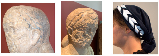 Details are highlighted by stripes painted with the same pigment on what appears to be a raised double-ribbed headband. Although both strands showed visible stripes on a picture published in 1930 [27] (Table 26 Figure C), only approximately half of the painted stripes on the first band remain visible today. That said, the diagonal arrangement and clear separation of individual stripes interspersed with light stripes may represent two ribbons twisted in contrasting directions, creating a herringbone pattern [32] (p. 199, Figure 20.2). Since the stripes are only preserved at the left side of her head, it is unclear whether the ribbons ran parallel from one side to the other across the head, or if they were mirrored at the crown, but it is reasonable to assume they were emulated across the whole headwear.