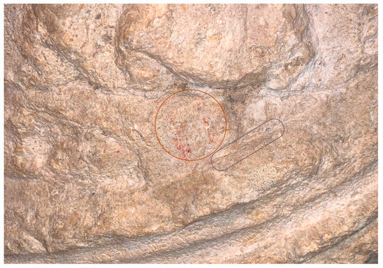 Microphotographs were captured of features retaining extant pigment or surface treatments (Figure 8 and Table 1). Some traces survived extremely well (Figure 9), but many presented with a whitish crustation in the polychrome matrix. The source of this is likely salination products commonly found on limestone sculpture [53] or other natural products resulting from its calcareous character, but this could not be confirmed in situ since the Geochem2 mode of the Vanta instrument does not detect Na. Most research on this topic revolves around desalination by conservators rather than the process of salination or limestone by-products that can interfere with extant pigments and other surface treatments and, consequently, their detection by non-destructive analytical instruments. This is an aspect that will be addressed through ongoing research.