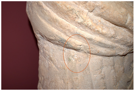 The original polychromy applied to the upper garment offers more intrigue. Although traces of red are visible at the front, just above the bulge of the palla (Figure 6), light yellow-greenish colours were recorded 100 years ago [27] (p. 272), but those can no longer be seen with the naked eye. It is possible that these and other surviving pigments were unintentionally removed during cleaning of the statues in the 1950s [41]. The colour of the palla was always described as greyish-black, though this dark colour was only visible on top of the bulge and below it. Therefore, it probably served as a shading colour or painted demarcation of individual features, see below.