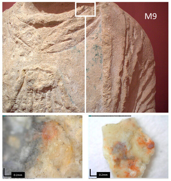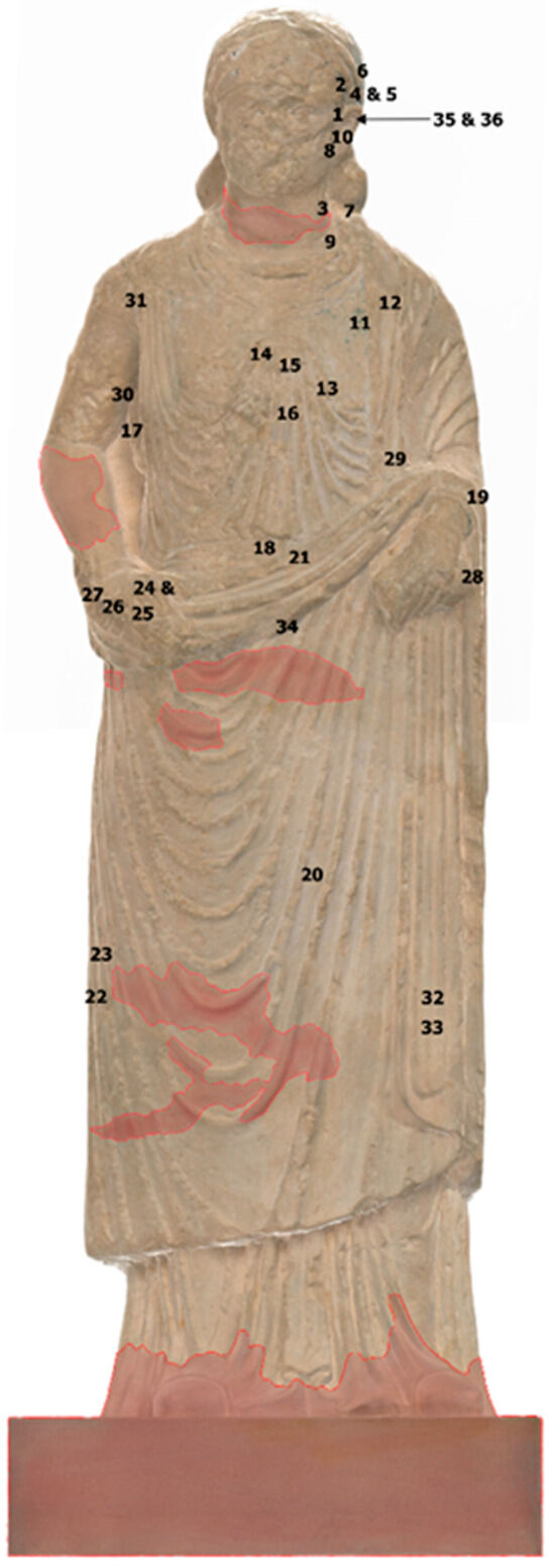 The scarf folded into the woman’s neck above the tunic retains a few barely visible patches of red beside dark colours [42], but the latter is only in the fabric folds (Figure 4, left). The same dark pigment is visible at different locations, always in shaded areas and between garment folds on the two complete statues (Figure 6).