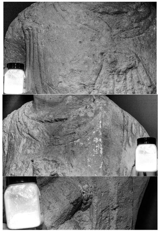 In addition to ancient pigments, traces of more recent paint are also present on the statue, probably the result of contamination from storage conditions. Shortly after their recovery, all of the statues were transferred to the “Sammlung Nassauischer Altertümer” as gifts. This collection of antiquities is part of today’s Stadtmuseum am Markt in Wiesbaden. Although the statues were part of an exhibition in Wiesbaden for around 120 years, the high number of monuments included in a “hall of stones” from Antiquity meant that the Ingelheim statues received very little attention during the 19th century [43] (p. 16, Figure 1; p. 17, Figures 2 and 3). For many years, the figures were placed against a wall [44] (pp. 155–156), where they likely received some surface scratches. Indeed, green and black brush strokes can be found on the right side and the back of the woman’s statue (Figure 7). The colours are not degraded in the manner of original pigments, so it is reasonable to assume these are more modern contaminants. During WWI and WWII, the circumstances of storage are not clear and it is, therefore, possible that some of the surface scratches could have occurred during these recent episodes of the statues’ itineraries. On a positive note, the statues were unlikely to have ever been installed outdoors for long periods of time and, therefore, not exposed to extreme weather or harsh environmental conditions.