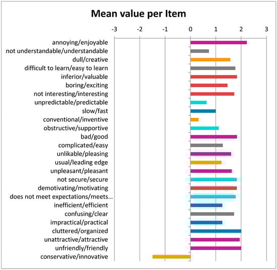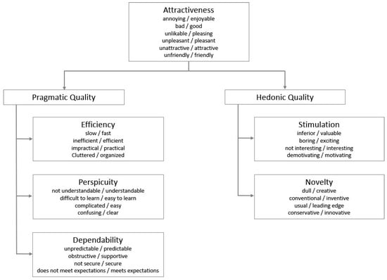 - Laugwitz, B.; Schrepp, M.; Held, T. Construction and evaluation of a user experience questionnaire. In HCI and Usability for Education and Work, Proceedings of the 4th Symposium of the Workgroup Human-Computer Interaction and Usability Engineering of the Austrian Computer Society, USAB 2008, LNCS 5298, Graz, Austria, 20–21 November 2008; Holzinger, A., Ed.; Springer: Berlin/Heidelberg, Germany, 2008; pp. 63–76. [Google Scholar]