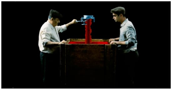 The process is rendered with a mixture of actual humans dressed as workers who were correlated with digitally produced representations of the specific machine, which could be described as follows: tomato juice boils in the cauldron (bolla) under a vacuum to condense and become a pulp (Figure 2). When the process is complete, the worker opens a valve, and the pellet falls into a cart below, as shown in the illustration below (Figure 2).