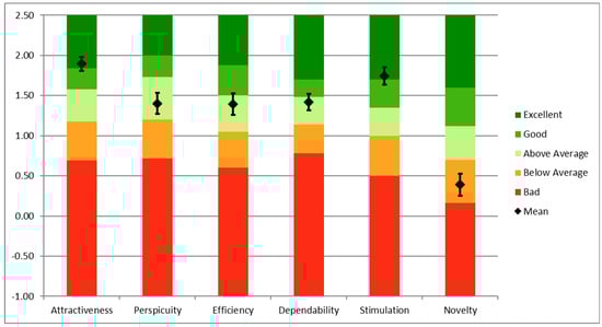 The creators of UEQ freely offer at the site manuals, related questionnaires, and spreadsheets for data analysis. In these spreadsheets, the response data input automatically produces results in relation to how the resulting average values are characterized (excellent, good, above or below average, and poor) for each scale based on special benchmarks that the researchers have developed []. This flexible method can be applied in different evaluation scenarios [] and was seen as very appropriate and useful for the specific evaluation process described in this paper, given the existence of special benchmarks according to the area of use.