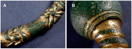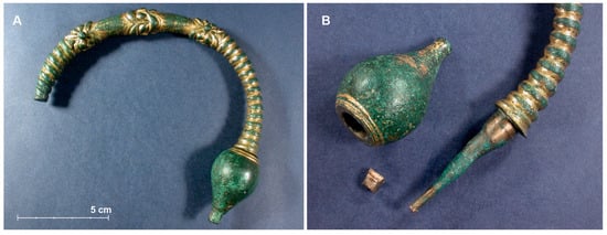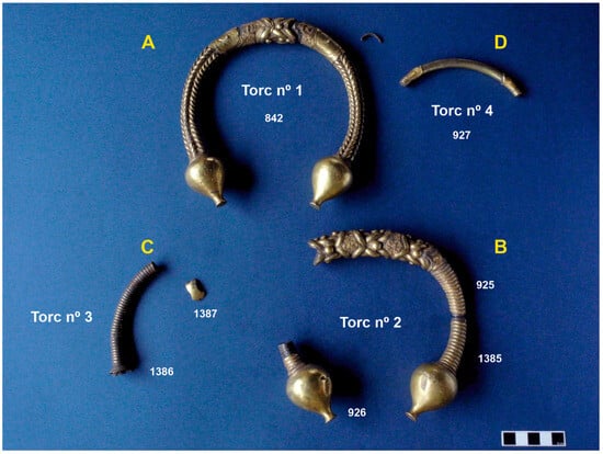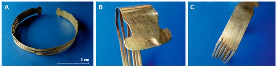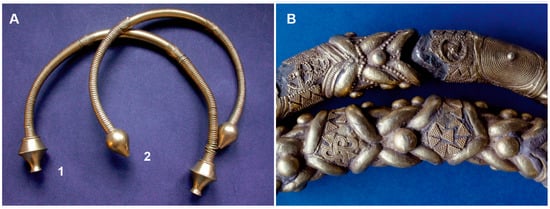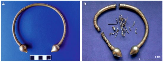 Among the examples with the least representation are those that some scholars have defined as “transgressive” torcs [17] or with “Baroque” decoration [37] (p. 172), as they best reflect the changes in the rigid formal canons of such objects. These torcs are characterised by hoops with a plastic surface (Figure 1B), a tripartite ornamental scheme, and voluminous hollow terminals. Like some Artabrian examples, their hoops have a core obtained from alloys of less precious metals that were subsequently gilded. Only four or five specimens are known [38,39] and the MAC collection includes the best-preserved ones.