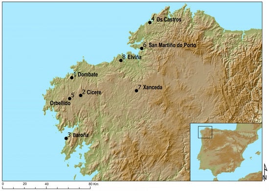 - Ramil Soneira, J.; Ramil Rego, E. Museo de Prehistoria e Arqueoloxía de Vilalba. Guía Breve; Xunta de Galicia: Santiago de Compostela, Spain, 2004. [Google Scholar]