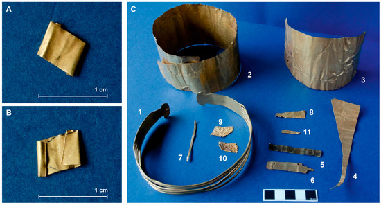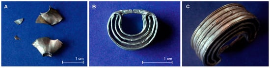 Cícere (O Mato de Cícere, Sta. Comba, A Coruña) (MAC-3780/1-11). An incomplete assemblage whose exact original composition is unknown (Figure 3C). It is currently made up of a sheet collar (MAC-3780/1) and 10 laminar fragments, of which four would have corresponded to two bands that can be interpreted as diadems (MAC-3780/3-4 and MAC-3780/2 y 10), and another two to another possible sheet collar (MAC-3780/6-7) [42,49] (pp. 101–104). The objects were discovered by chance, perhaps at different times, and were altered after discovery. Around 1935, they were acquired by a family who kept them until they were deposited in the museum in 1999 [42] (pp. 174–176). They were unveiled more than fifteen years after that acquisition, indicating their origin from a burial mound [50] (p. 292). The set has been dated to the Early Bronze Age, mainly due to the presence of a sheet collar or strip band (Figure 3C, 1 and 6).