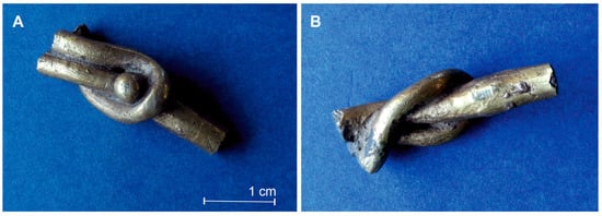 Xanceda 3 (MAC-1386; MAC-1387) (Figure 6, C). Two fragments of a torc of dubious typology corresponding to the end of the lateral third of a hoop with the remains of a terminal and a terminal fragment. The hoop fragment presents a decoration in the form of a ribbon-coiled wire that could have been obtained from the lost-wax casting process. However, corrosion makes a suitable examination difficult. Its surface was originally gilded but has now lost much of its coating. The piece included terminals of the same type as those documented in Examples 1 and 2.
