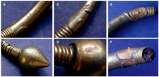 Artabrian-type torcs: (A). triangular motif stamped on the hoop of the San Martiño do Porto torc; (B). pyriform terminal of the same piece; (C). spiral-shaped decoration on the Orbellido torc; (D). chiselled decoration on the back of a terminal of the same torc; (E). decoration on the hoop in Torc 4 from Xanceda; (F). silver core at the end of the hoop of the same torc.