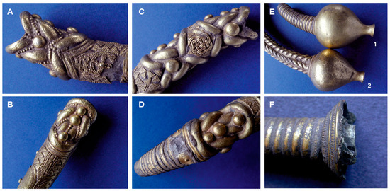 Baroque-type torcs from Xanceda: (A,B). plastic and applied decoration in the central part of the hoop of torc 1 (lateral view and external edge, respectively); (C,D). plastic and applied decoration in the central part of the hoop of Torc 2 (lateral view and external edge, respectively); (E,F). terminals and lateral thirds of the hoops (E1: torc 2; E2: torc 1; F: torc 3).