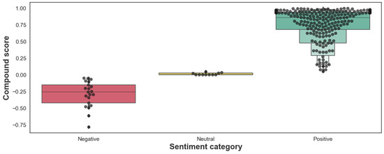 Furthermore, VADER sentiment is a rule- and lexicon-based framework for sentiment analysis, supporting intensity estimation [5]. VADER uses qualitative rules and quantitative calculations to generate sentiment scores (positive, negative, and neutral) for each text [75]. Evaluation of the distribution of compound scores guided the development of our tool. The compound score, a metric normalized between −1 and +1, is essential for classifying sentences as positive, neutral, or negative [76,77]. Typical thresholds are positive sentiment: composite score ≥ 0.05; neutral sentiment: composite score > −0.05 and < 0.05; and negative sentiment: composite score ≤ −0.05.