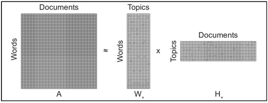 Here, V is the original textual data matrix used to decompose, while W and H are the resulting matrices containing the corresponding non-negative basis vectors and coefficients, respectively. This decomposition minimizes the reconstruction error between V and WH [68,84]. For a better understanding, Kuang et al. [85] were able to conceptualize the NMF decomposition of a matrix composed of m words in n documents into two non-negative matrices of the original n words by k subjects and those same k subjects by the original m documents (Figure 2).