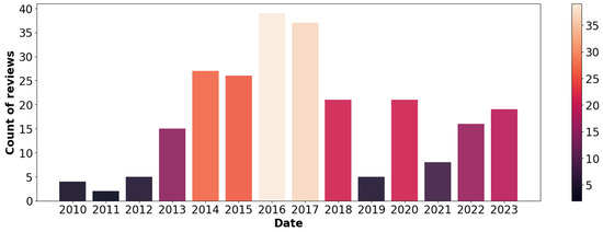 Count of reviews over time. Note: The color scale on the right of the bar chart identifies each hue corresponding to the specific number of comments associated with each bar, representing a given year.