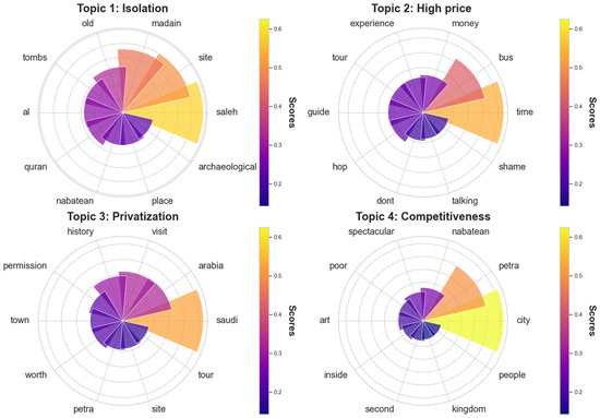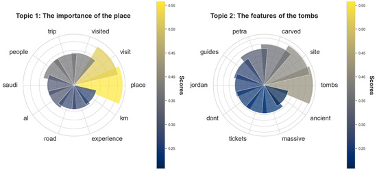 The most frequent bigrams and their dendrogrammatic co-occurrence matrix (Figure A2 in Appendix B) eloquently demonstrate that “Hegra” is the scene of a remarkable interconnection between the bigrams “Al Ula” and “Saudi Arabia”, with 55 occurrences for pairs involving “Al Ula” and 44 for those associated with Saudi Arabia. This data illustrates the perception of Hegra visitors as an indispensable pillar of its geographical and cultural environment. Hegra’s global stature as a heritage is underscored by the substantial frequencies of the terms “World Heritage” (32 occurrences), “Archaeological Site” (21 occurrences), and “Heritage Site” (17 occurrences), reflecting a valuation of its cultural and historical importance on a global scale. On another note, our analysis highlights an enthusiasm for history and archaeology, illustrated by the repeated presence of the term “Nabatean Kingdom” 13 times, thus revealing that the educational dimensions of the visit are highly esteemed. The association of Hegra with “UNESCO World” (19 occurrences) and the reciprocal mentions between “World Heritage”, “Heritage Site”, and “UNESCO World” highlight the recognition of the importance of preservation and a dedication to sustainability.