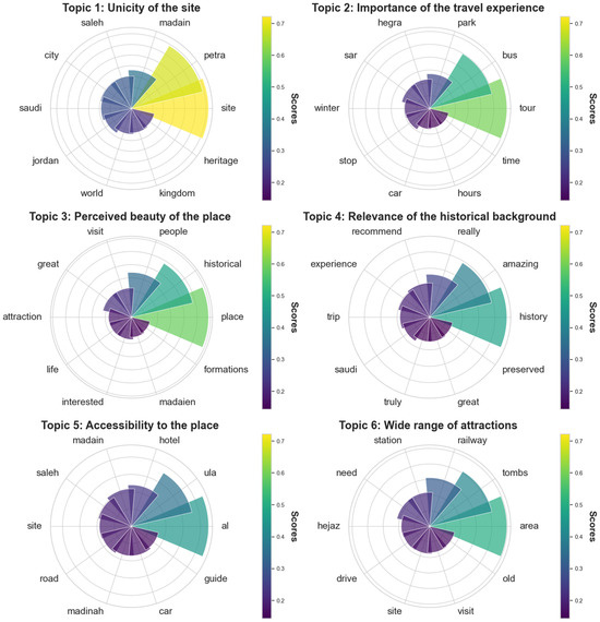Furthermore, the most frequent trigrams and their dendrogrammatic co-occurrence matrix (Figure A3 in Appendix B) outline specific details of visit perceptions at these historical sites, focusing mainly on world heritage status and pre-Islamic history. The trigrams “world heritage site” and “UNESCO world heritage”, each mentioned 11 times, emphasize the importance of the site’s international recognition and its esteem among visitors. The series of trigrams referring to “pre-Islamic archaeological site”, appearing four times each, testify to a marked interest in the ancestral history of the region, including the imprint of Lihyanite and Roman occupations, Nabatean rule, and the ensuing historical chronology. These references illustrate a valuation of the complex layers of the site’s pre-Islamic history and its archaeological significance. Mentions of “archaeological site located” and “site located alula” (four occurrences each), as well as “al madinah region” and “madinah region saudi” (four occurrences each), underscore that the specific location of the site in the Al Madinah region in Saudi Arabia significantly contributes to its tourist appeal.