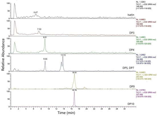 According to the results (Table 3), the indigoid degradation products isatin (IS), isatoic anhydride (DP3), N-methoxycarbonyl-anthranilic acid (DP7), DP4, DP5, DP6, DP9 and DP10, as identified in a previous study [], were detected in the aged sample of the standard solutions of IND. The degradation products DP3, DP4, DP5, DP6, DP7, DP10 and IS were detected in negative ion mode, and the degradation product DP9 was detected in positive ion mode. Figure 1 illustrates the chromatograms of IND solutions following 30 days at room temperature without light, in which the degradation products of the component appear.
