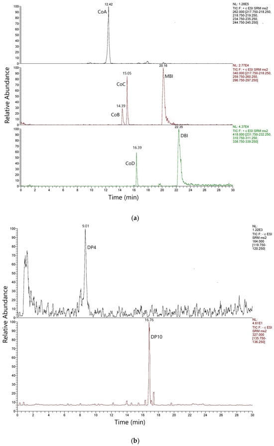 Chromatograms of the fresh shellfish purple colorant solution (from Hexaplex trunculus L.). The compounds A–D [] (a) and traces of DP4 and DP10 [] (b) are provided above, as extracted from sample chromatograms (Table 3).