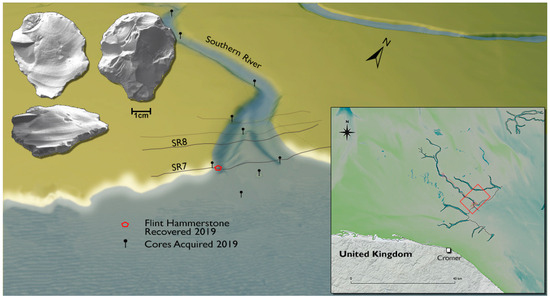 The opportunities provided through such data were evidenced during a 2019 Anglo-Belgian survey expedition, when a worked lithic was recovered from the banks of a submerged palaeochannel, off the Norfolk coast and known as the Southern River valley [24,147]. Prior coring campaigns had confirmed the presence of a channel and estuary at this position, but also that contemporary sediments, dated as active in the early Holocene, around 8827±30 cal BP, were exposed at the seabed. Given the archaeologically and ethno-historically attested predilection of various hunter-fisher-gatherer societies for coastal and estuarine ecological settings and the presence of early deposits exposed at the seabed in this area, a speculative dredge was undertaken along a transect across the river mouth and the banks [24]. The recovery of a lithic flake, identified as a possible hammerstone fragment [23], presumably related to the exposed Holocene surface, was located either on, in, or very close to the dated horizon.