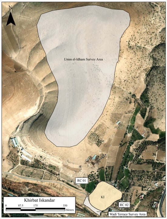 - Richard, S.; Long, J.C., Jr.; D’Andrea, M. Expedition to Khirbat Iskandar and Its Environs: The 2019 Season. Hawiliyyat Da’irat Al-Atar Al-‘Amm. (Annu. Dep. Antiq. Jordan) 2023, 61, 349–364. [Google Scholar]