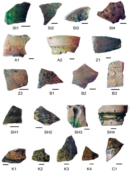 Glazed ceramic sherds collected from several European archaeological sites dated to the 13th–14th centuries. St—Saintonge; A—Ardenne; Z—Zomergem; B—Bruges; SH—Surrey–Hampshire; K—Kingston; and C—Cheam. Scale bar: 10 mm.