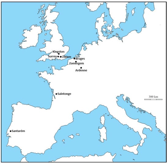 The sherds analysed as comparative productions in this paper were obtained from different excavations in different parts of Northern Europe in sites possible to date to the 13th to the 15th century. The Saintonge, Surrey–Hampshire, Kingston, and Cheam types were all found in unstratified contexts in the greater London area and were classified by pottery specialists. As for the remaining types, these were obtained in the Ardenne, Zomergem, and Bruges areas. They were found associated with kilns and pottery wasters, and are thus considered local productions [26,27]. The choice of these areas as comparative productions was based on two basic premises. First, this area had frequent commercial relations with Portugal in the 13th and 14th centuries [11], and second, ceramics produced in this area are frequent finds in Portugal [12,13].