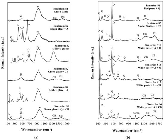 Micro-Raman spectra from the most significant glazed surfaces (a) and pastes (b) of the Santarém sherds. Quartz (Q), anatase (A), hematite (H), magnetite (M), carbon black (CB), stretching (υ) and bending (δ) of Raman envelopes.