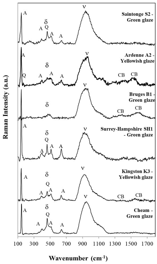 Micro-Raman spectra from the most significant glazed surfaces from the European sherds. Quartz (Q), anatase (A), c arbon black (CB), stretching (υ) and bending (δ) of Raman envelopes.