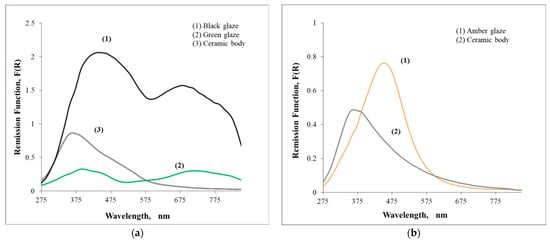 Ground-state diffuse reflectance absorption spectra for all coloured sherds in Figure 1 and Figure 2 are presented in Figure 6 and Figure 7, where the remission function is the ordinate and the wavelength in nm is the abscissa. Figure 6a shows the absorption spectra of sample S2, the one with black grapes. The green glaze presents two maxima, one at about 380 nm and the other in the visible region, maximising at ca. 700 nm. The absorption in the red region produces the observed green colour (the complementary colour of the red). The black grapes are characterised by a high value of the remission function both in the UV and visible regions of the spectrum. By contrast, the ceramic body absorbs primarily in the UV region.