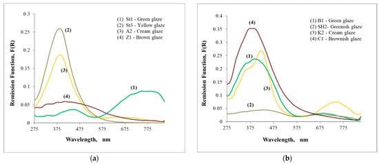 GSDR absorption spectra of European sherds: (a) St1—Saintonge green glaze; St3—Saintonge yellow glaze; A2—Ardenne cream glaze; Z1—Zomergem brown glaze; (b) B1—Bruges green glaze; SH2—Surrey–Hampshire greenish glaze; K2—Kingston cream glaze; C1—Cheam brownish glaze.
