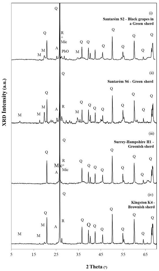 The ceramic bodies retrieved from both the Santarém pits and European archaeological sites underwent comprehensive analysis using X-ray diffraction (XRD powder method). As illustrated in Figure 8 (limited to whitish pastes), the striking resemblance between the two groups outweighs any noticeable distinctions. All pastes were crafted from siliceous raw materials, resulting in pronounced quartz (Q) signatures. Alongside amorphous/nanocrystalline phases, which XRD cannot fully characterise, a select number of minor minerals were identified, including muscovite, rutile, anatase, microcline, and plagioclase. Hematite was found only in the red pastes. Furthermore, the presence of muscovite or illite/muscovite thermal-derived phases was observed (see Table 1). This temperature-dependent phenomenon, primarily governed by dihydroxylation, is discernible in XRD pattern modifications, particularly evident in characteristic reflections at 2θ = 8.9 and 2θ = 19.8. These modifications facilitate the assessment of minimum kiln temperatures [22].