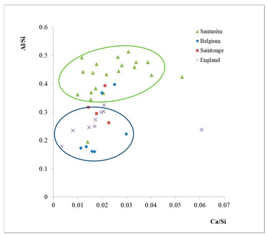 The scatterplot for Al/Si versus Ca/Si (% wt ratio) for all sherds (Figure 9) reveals two distinct clusters, with the upper one corresponding to Santarém samples and the lower one to the European group. There are a few samples that slightly deviate from this general clustering. The Santarém sample S1 (red paste), is positioned in the group of the blue ellipse, the European one. Saintonge St1 and Ardenne A1 and A2 are included in the Santarém green ellipse. Santarém samples exhibit a distinctly higher aluminium content, while the majority of European ceramic bodies are more quartz-rich. The Ca/Si ratio shows little variability as, in general, CaO contents are very low, and according to the XRD-identified mineralogy, they can be correlated with the presence of Na-Ca plagioclase.