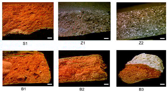Selection of representative Santarém (S1, Santarém), and European red (Bruges—Belgium B1, B2, B3) and grey–brown (Zomergem Z1, Z2) fabric pastes. Scale bar: 1 mm.