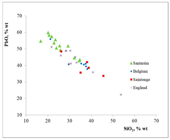 Figure 11 shows the correlation between the flux, PbO, and the SiO2 content, suggesting a linear relation between them. Indeed, the flux content is higher in the Santarém samples (the green triangles).