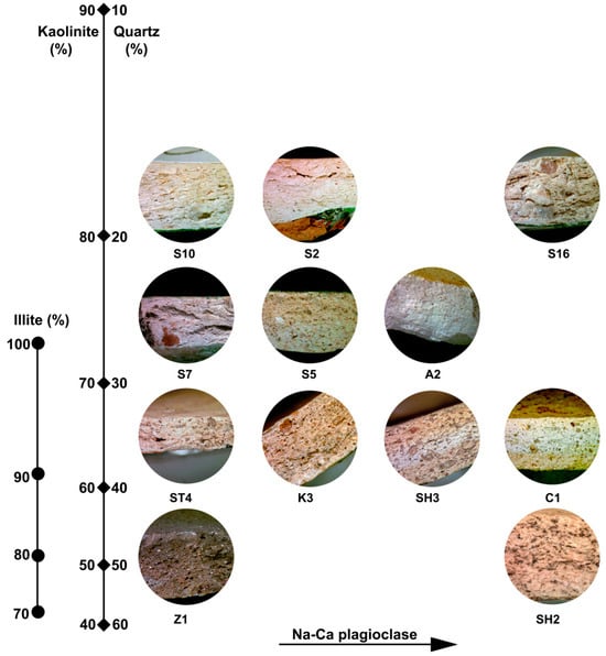 The combination of chemical data (Table 2 and Table 3) with the fabric analysis of the light sherds, including sample Z1, observed through stereomicroscopy, is represented in Figure 12. Alongside the Al/Si and Ca/Si values that determined the positioning of the samples in the figure, two parallel vertical axes were placed, aiming to establish a correspondence between the ceramic and the raw material that it originated from (clay–quartz mixture) for a given value of Al/Si. Given the aluminous and siliceous composition of the pastes, with a low content of K2O, hypotheses of kaolinite–quartz and illite–quartz mixtures are considered based on their ideal chemical compositions. On the horizontal axis, we placed the slight trend of enrichment in CaO instead of the Ca/Si parameter, which, according to observations, is due to the presence of relic feldspar (Na-Ca plagioclase) in the ceramic paste (e.g., sample S16).