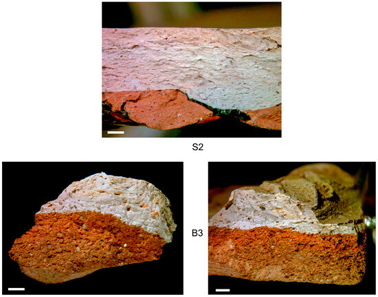 Selection of representative Santarém (S2—Santarém) and European (B3—Bruges—Belgium) red combined fabric pastes. Scale bar: 1 mm.