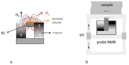 (a) U-shaped unilateral NMR sensor by Bruker Biospin; (b) unilateral NMR sensor by Magritek. The sensor is placed on a lift that allows one to move the magnetic field inside the object to be analyzed with micrometric steps.