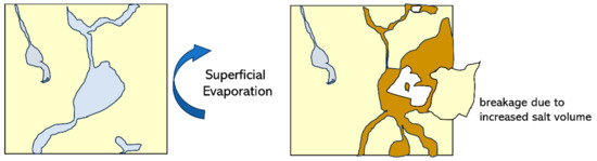 The saturation of the porous system, due to the continuous deposit of salts, determines the occurrence of states of stress that produce bulges, detachments, and the phenomena of surface degradation (Figure 2).