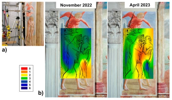 Figure 5b shows the distribution maps obtained in two different seasons of the year by unilateral NMR show a depth of 1 mm on the left pillar of Brancacci Chapel, decorated with Cacciata dei Progenitori dall’Eden by Masaccio. The moisture distribution map derived from NMR data processing in the “Cacciata” scene was recorded in November 2022 and was suitably calibrated, see Figure 5b left, showing a moisture content (MC) in this area of the chapel to fall within the 0–6% range. Specifically, in the most humid region, an MC value of about 6% was found.