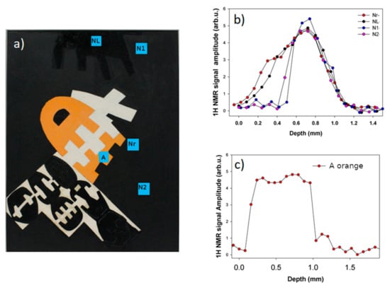 (a) Surface image 538, the letters indicate the measuring points. (b) 1H NMR profiles obtained on the areas: NL—Glossy black area; Nr—Black area, repainted; N1—Matt black area without repainting; N2—Matt black area without repainting. (c) 1H NMR profiles obtained on orange zone A.
