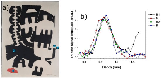(a) image of painting 553; (b) profiles 1H NMR on painting 553, obtained on the areas: B1—white on the frame, B2—white; and R—red.