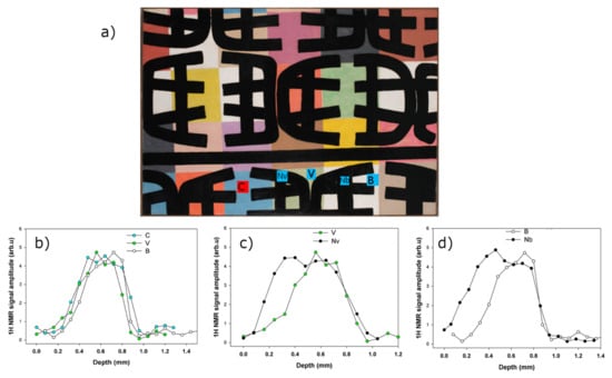 Figure 8c,d show the comparisons of the 1H NMR profiles obtained on the colored areas and on the black areas above. Both black areas analyzed show the presence of two layers of paint, the surface black of about 0.4 mm, and the underlying of about 0.6 mm relative to the colored area.