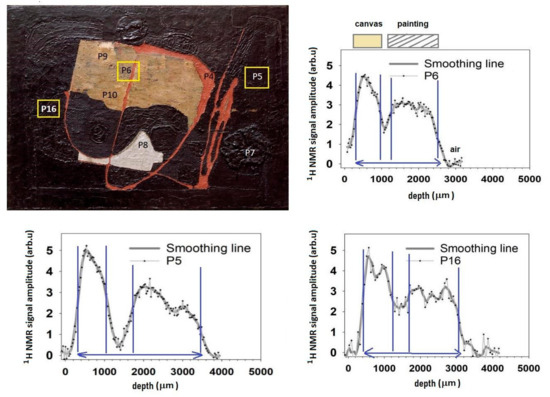 The stratigraphic profiles acquired with NMR have shown a high variability from area to area, due to the different pictorial execution of Burri, the different materials used, and the state of conservation. In this preliminary investigation of the painting, three types of statistical profiles have been identified, characterized by different total thicknesses: stratigraphic profile thickness less than 3 mm (point 6); stratigraphic profile thickness of about 3 mm (point 16); and lastly, the thickness of the stratigraphic profile greater than 3 mm (maximum value found 4 mm). Figure 9 shows three areas analyzed with different NMR stratigraphic thicknesses.