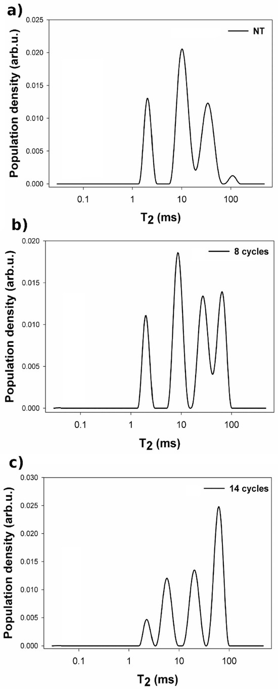 Comparison of distributions of T2 in the Sabucina Stone before and after artificial aging. (a) untreated sample (NT); (b) sample aged for 8 cycles aging sample; and (c) sample aged for 14 cycles. The distribution of T2 was obtained by averaging and fitting the signal of the transverse component of the magnetization acquired at depths of 1000, 700, and 400 μm from the surface of the sample.