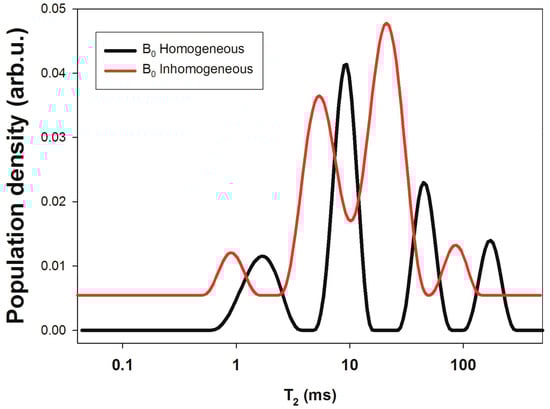 where D is the diffusion coefficient, is the gyromagnetic ratio of the nucleus observed, and is the echo time. The effect of diffusion may be significantly reduced by employing a CPMG sequence with the shortest possible echo time to measure T2. In Figure 11, the okT2 distributions of the Sabucina stone under homogeneous and inhomogeneous magnetic fields were compared. As expected, although the number of T2 components is the same, a shortening of T2 values can be observed.