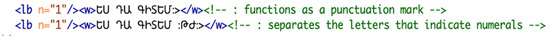 Alongside the internal reference, we actively explored the feasibility of using the guidelines outlined in the EpiDoc framework for encoding symbols and punctuation. Initially intended for encoding various symbols, these guidelines have proven to be compatible with Armenian inscriptions in some cases. By implementing these guidelines, we align our work with the recognized standards of EpiDoc while effectively accommodating the unique characteristics of Armenian inscriptions, including their distinctive use of punctuation marks and symbols.