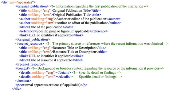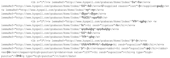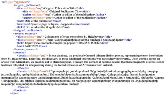 13]. This comprehensive framework is tailored explicitly for ancient inscriptions and their associated texts, offering an XML-based markup standard that is the backbone of our methodology. The adoption of EpiDoc was a strategic choice driven by its ability to provide a robust and structured framework for the effective organization and presentation of data related to Armenian inscriptions.