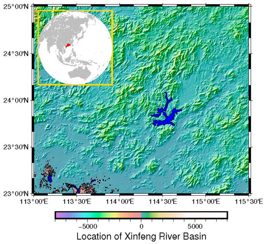 Location of research area. The blue area at the center of the map denotes the Xinfengjiang Reservoir. The red political area in the inset world map denotes The Guangdong Province, China.
